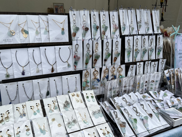 彦根の平和堂HATOスタジアムの物販コーナーに、このお二人のお店があり、わたしも販売員として参加してきた。琵琶湖のシーグラスを利用して作られた品々がズラリと並んでいる。その名も「びわ湖グラス」。滋賀県内の観光場所やホテルのお土産物コーナーなどでも売られている。