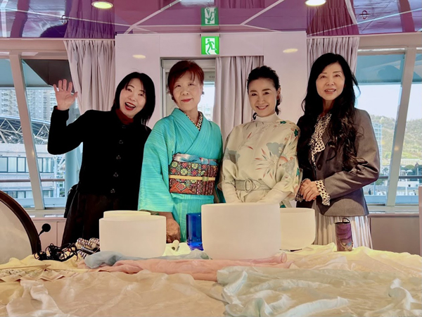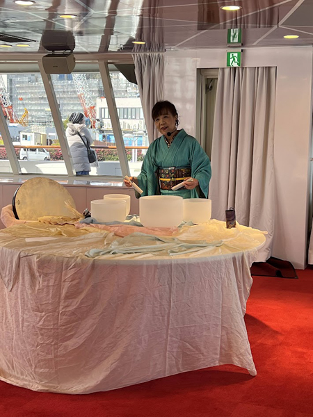 この日のアトラクションには、昨秋いっしょにイベントを主催した中将ゆみこさんによる~語りとクリスタルボウル『春の琵琶湖に龍神と弁財天を寿ぐ』~、と題された厳かな祈りの調べ。