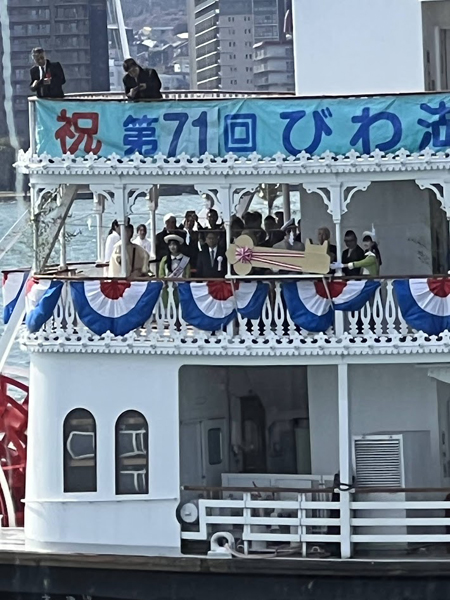 びわ湖開きの催し自体はミシガンで行われ、我々はミシガンと並行して湖上を走るビアンカの船上から「びわ湖開き」を眺めるという趣向である。